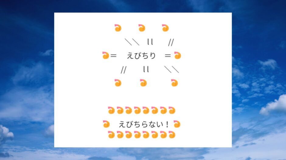 以上、「エビチリ・エビ散らない」「エビチリ・エビ散らない・エビdense」の絵文字一覧 コピペまとめ でした!